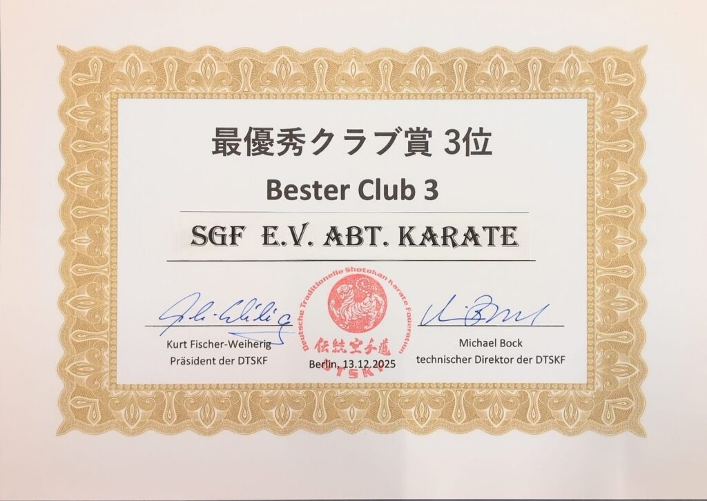 Grundausrichtung des Shotokan dokumentierte. Weiterhin sind wir Mitglied in der ITKF/ ETKU über die DTSKF und folgen der Tradition des Traditionellen Karate und der Lehre von Sensei Hidetaka Nishiyama (10. Dan), sowie seinem ehemaligen Schüler Prof. Dr. Wladimir Jorga (10. Dan), die uns mit ihrem fundamentalen Wissen in jeglicher Hinsicht unterstützt.